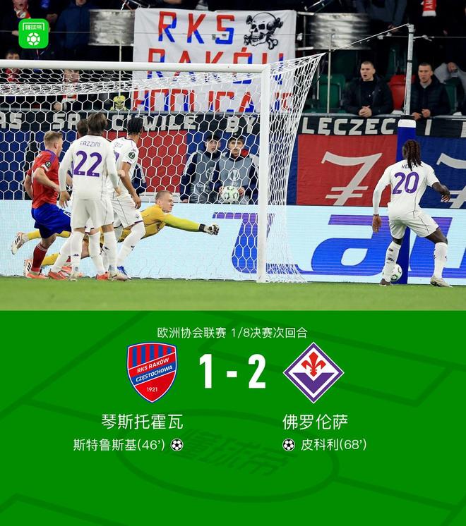 北京时间3月20日欧洲协会联赛 1/8决赛次回合,琴斯托霍瓦对阵佛罗伦萨。上半场斯特鲁斯基首开记录下半场恩杜尔射门皮球碰到皮科利折射入网,补时阶段庞格拉契奇超远距离破门锁定胜局。最终比分琴斯托霍瓦 1-2 佛罗伦萨。两回合总比分琴斯托霍瓦2-4佛罗伦萨。